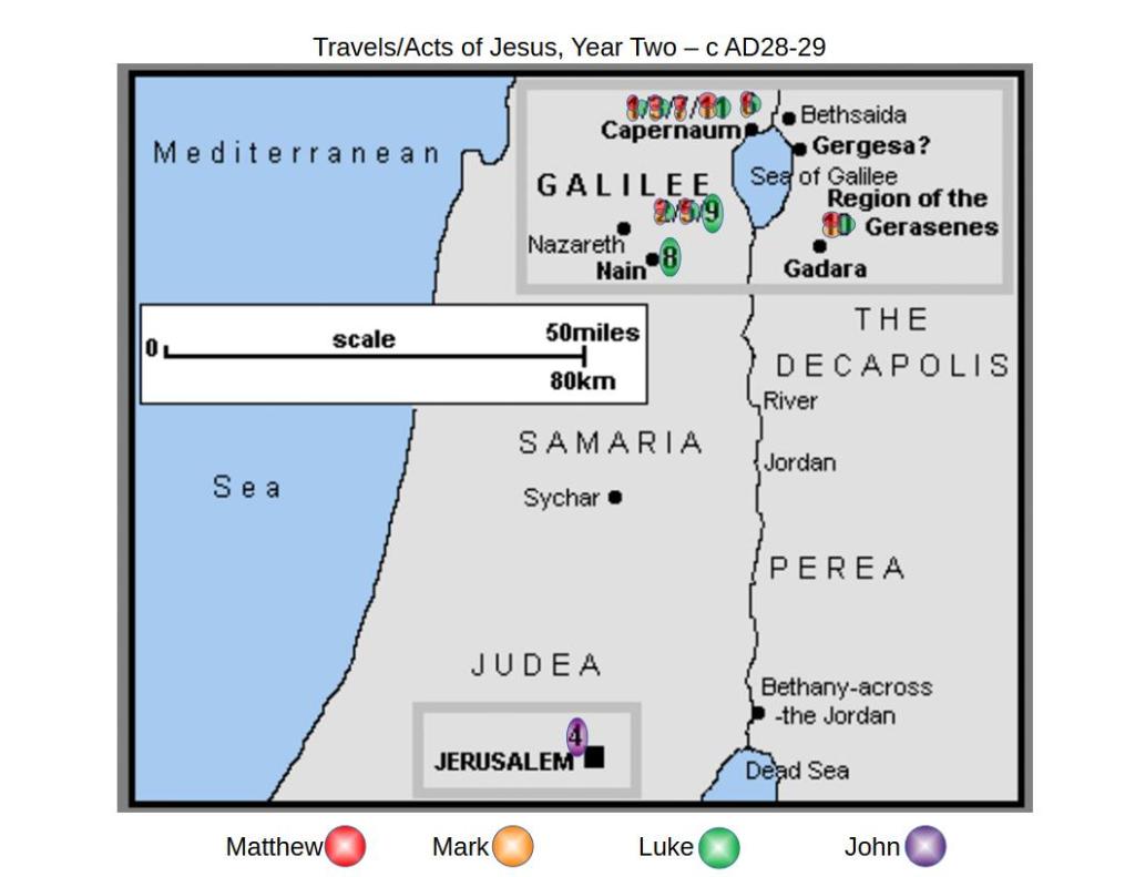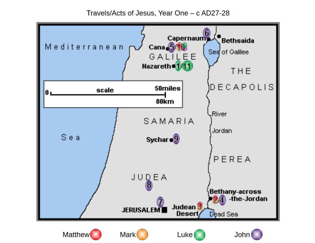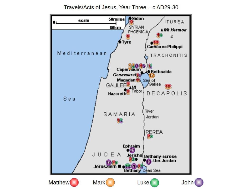 This page is to help visualize the travels of Jesus as He went around performing miracles and teaching. What I find interesting is that the Gospel of John only records south of the Sea of Galilee, and the second year only in Jerusalem. Eleven times He’s the only one recording an event, and 6 times he corroborates what another Gospel has recorded. This means that maybe John read the synoptics, and then only wrote about things they missed, or that he thought was important.